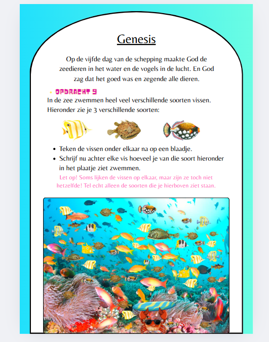 Het Bijbelverhaal Genesis wordt in dit leerwerkboek verteld op een wijze die geschikt is voor de leeftijdscategorie. Daarnaast biedt het boekje werkopdrachten aan voor rekenen, taal, kunstzinnige oriëntatie en wereldoriëntatie. Alle opdrachten en Bijbelverhalen worden afgewisseld door weetjes die de algemene kennis vergroten.