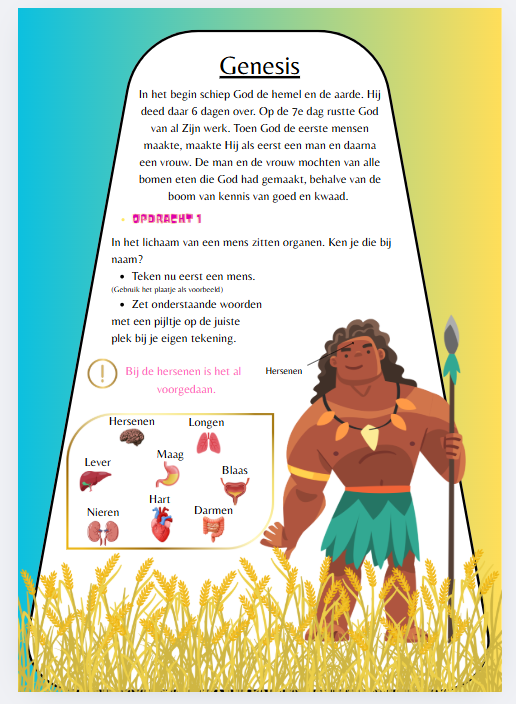 Het Bijbelverhaal Genesis wordt in dit leerwerkboek verteld op een wijze die geschikt is voor de leeftijdscategorie. Daarnaast biedt het boekje werkopdrachten aan voor rekenen, taal, kunstzinnige oriëntatie en wereldoriëntatie. Alle opdrachten en Bijbelverhalen worden afgewisseld door weetjes die de algemene kennis vergroten.